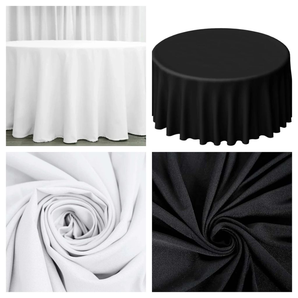 Polyester 120' Round Tablecloth, available in White and Black. Rental Price $11.50