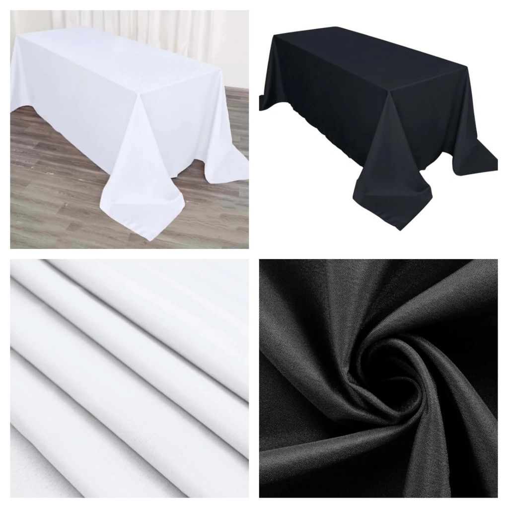 Polyester 90x132 Rectangular Tablecloth, available in White and Black. Rental Price $11.50