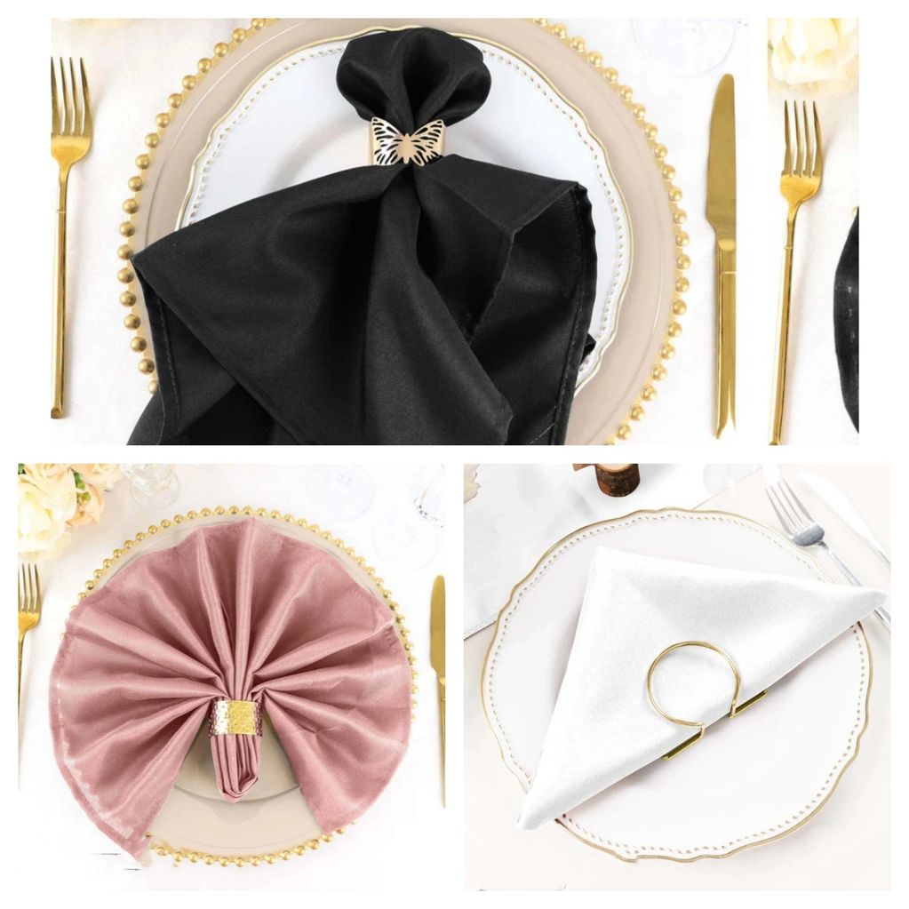 20x20 Polyester & Dacron Napkins, available in White, Black and Dusty Rose. Rental Price $ 0.80